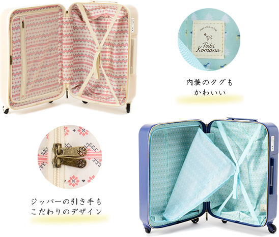 ボディカラー ベージュピンクは「クロアチア」、ネイビーは「北欧」とおそろいの柄です。片面に荷物の収納に便利なメッシュポケット付きファスナー開閉収納がつき、もう片面には荷崩れを防ぐ伸縮バンドが付いています。