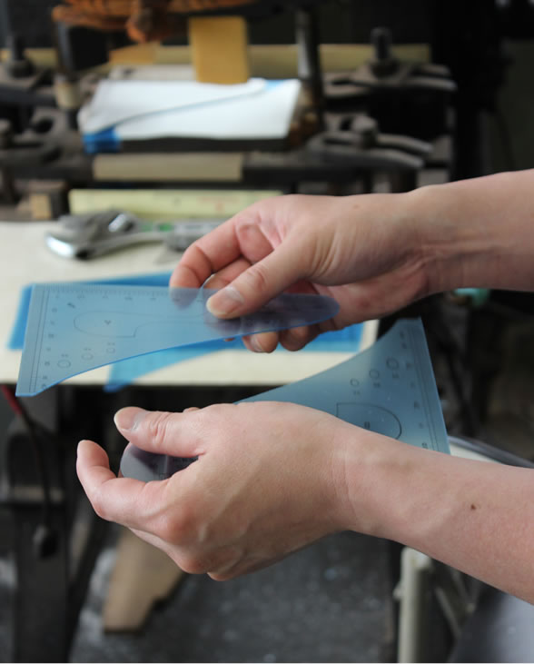 印字やカッティング、圧着を行い素材の「癖」を活かし調整する